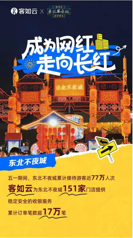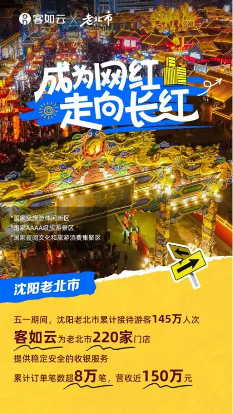根據(jù)數(shù)據(jù)統(tǒng)計(jì),五一期間“沈陽(yáng)老北市”累計(jì)接待游客145萬(wàn)人次,累計(jì)營(yíng)收超1000萬(wàn)元,還入選了五一假期最受歡迎“夜游景點(diǎn)TOP10”。今年老北市除了在夜間推出最強(qiáng)IP“龍鳳呈祥”表演外,還安排了豐富的夜間文藝表演,更好的讓游客體驗(yàn)其歷史風(fēng)貌和人文風(fēng)情。此外,最受歡迎的特色各異的美食小吃更是排起了長(zhǎng)隊(duì),其中,客如云便為老北市220家門(mén)店提供穩(wěn)定安全的收銀服務(wù),累計(jì)訂單筆數(shù)超8萬(wàn)筆,營(yíng)收近150萬(wàn)元。