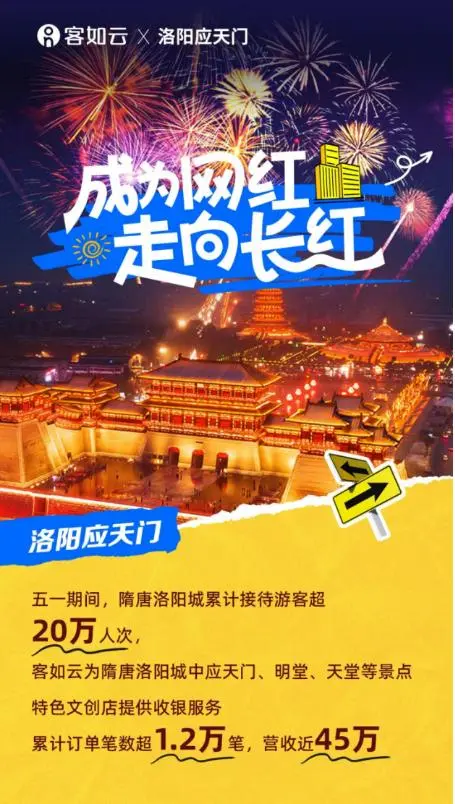 而隋唐洛陽(yáng)城在五一期間,上演了50余場(chǎng)古裝演藝,打造國(guó)風(fēng)盛宴。其中“國(guó)風(fēng)+漢服+演藝+文創(chuàng)周邊”吸引八方游客圍觀。洛陽(yáng)城景區(qū)里的文創(chuàng)商店和周邊漢服店深受年輕人群喜愛(ài),也豐富了景區(qū)的新零售場(chǎng)景。這個(gè)五一,隋唐洛陽(yáng)城累計(jì)接待游客超20萬(wàn)人次,單日最高接待量6萬(wàn)人次。客如云同樣也為隋唐洛陽(yáng)城中的應(yīng)天門(mén)、明堂、天堂等景點(diǎn)的特色文創(chuàng)店提供可靠有保障的收銀服務(wù),累計(jì)訂單筆數(shù)超1.2萬(wàn)筆,營(yíng)收近45萬(wàn)元。