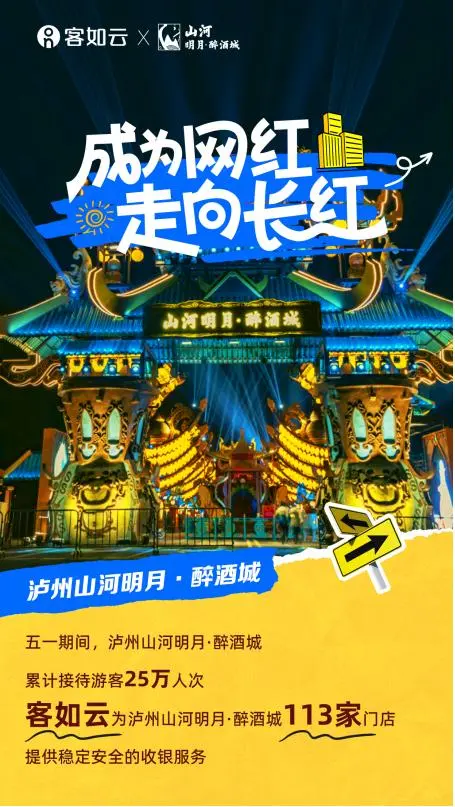 今年2月剛剛開(kāi)街的瀘州山河明月·醉酒城,以精致國(guó)潮文化、瀘州酒文化為主線(xiàn),將神話(huà)傳說(shuō)巨獸打卡、情景演繹貫穿其中,五一期間,瀘州山河明月·醉酒城累計(jì)接待游客25萬(wàn)人次,客如云為瀘州山河明月·醉酒城中113家門(mén)店提供穩(wěn)定安全的收銀服務(wù),與游客一起感受“酒文化”的氛圍。