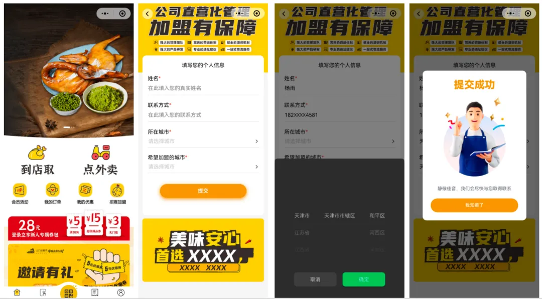 商家小程序端支持裝修招商加盟入口及頁面,用戶可填寫意向信息并且提交,總部招商部門進(jìn)行線索管理、流轉(zhuǎn)、導(dǎo)出等能力。
