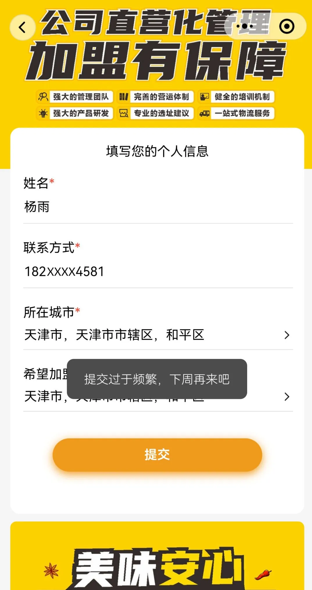 品牌連鎖店招商加盟日趨競爭激烈的數(shù)智化行業(yè),為防止品牌商家同行惡意競爭填寫資料,惡意擾亂招商秩序。客如云智享版餐飲管理系統(tǒng)全新招商加盟功能,做了用戶提交次數(shù)的風(fēng)控規(guī)則的限制。