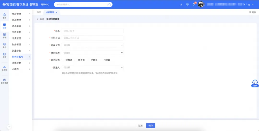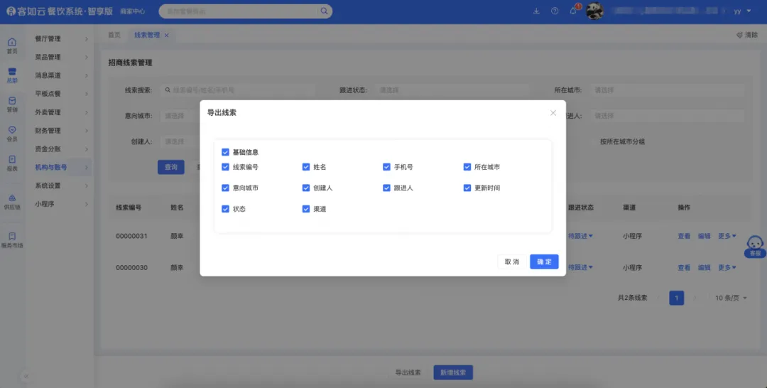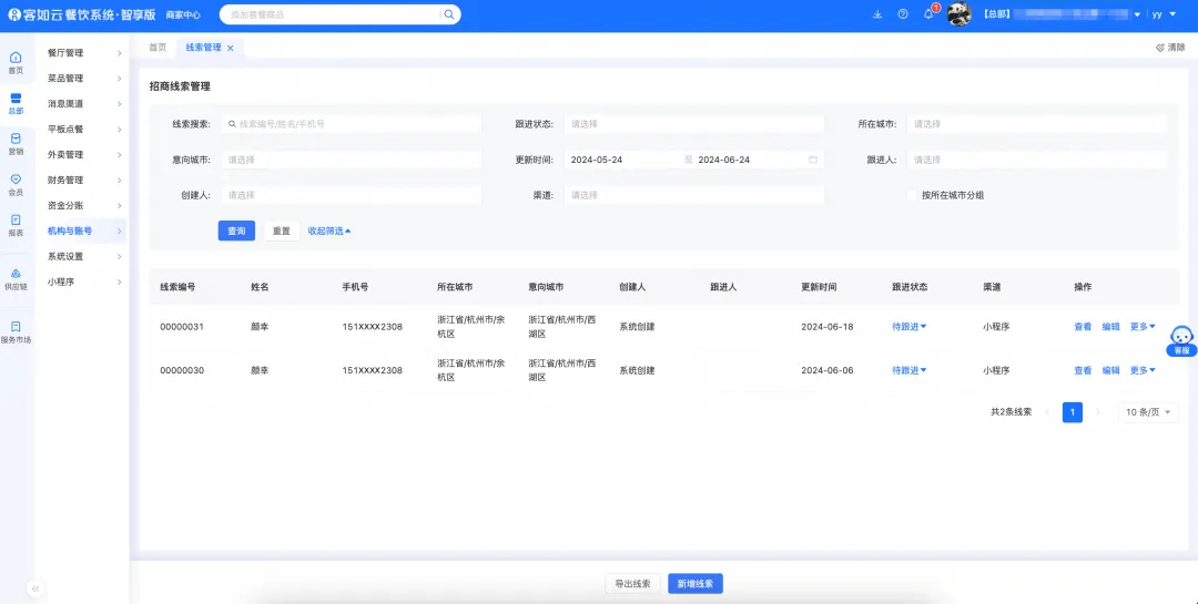 品牌連鎖商家們,可在客如云智享版餐飲管理系統(tǒng)中的商家后臺(tái),管理用戶提交的招商加盟線索信息,可視化系統(tǒng)分類管理匯總,方便招商人員業(yè)務(wù)跟進(jìn)與檢索。