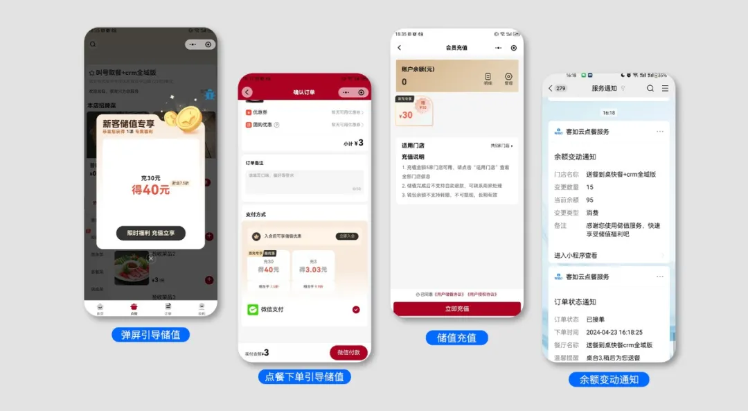 客如云數(shù)智化平臺小程序也可以為商家提供儲值充值功能 + 儲值余額支付功能,并深度嵌入到用戶操作中。如:彈屏引導儲值、點餐下單引導儲值,余額變動通知等,讓商家平臺會員經(jīng)營更輕松。