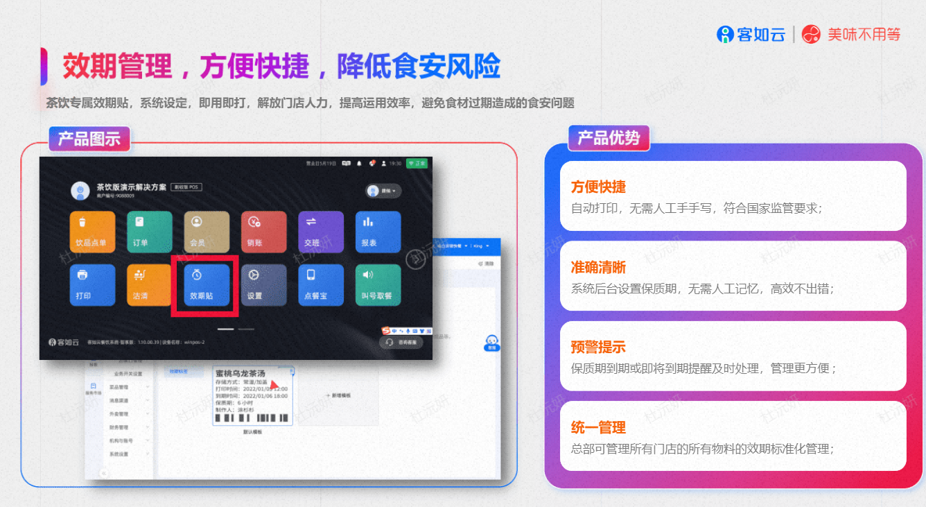 依托客如云收銀系統,生成茶飲專屬有效貼,標注上原料的有效期限,到期系統自動預警。同時總店也可以根據系統對所有門店的物料的有效期進行標準化管理,技術層面破解了加盟模式下 “管不到、管不細” 的食安管理難題。